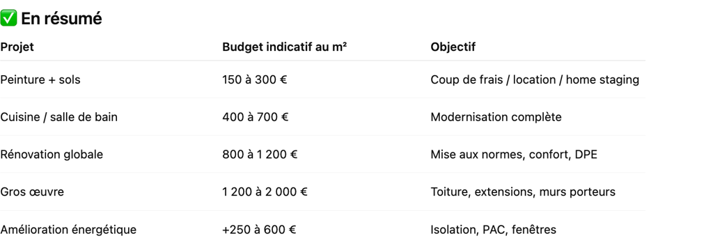 🎯 Petit calcul rapide : une maison de 100 m² à rénover entièrement coûtera entre 80 000 et 120 000 €, selon les postes à reprendre.