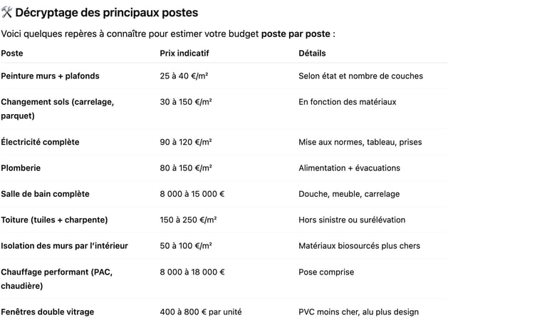 🛑 Rappel important : dans une maison ancienne, les devis peuvent grimper très vite. Mieux vaut surestimer un peu… que de finir en galère de budget à mi-chantier.